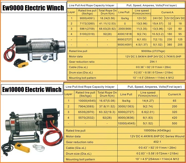 Ew9000 | 9000lbs(2727kgs) | 12V DC 3.5KW/4.8HP 24V DC 3.7KW/5.0HP | 294:1 | Φ11mm*28m | Φ72mm*218m |