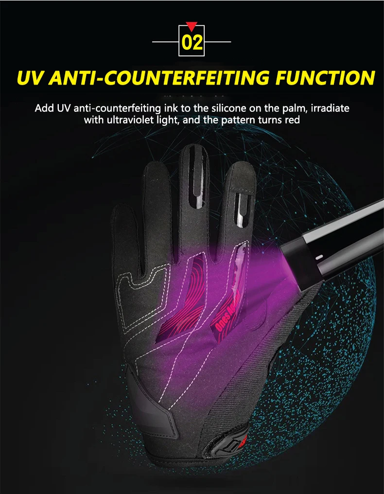 Add UV anti-counterfeiting ink to the silicone on the palm, irradiatewith ultraviolet light, and the pattern turns red