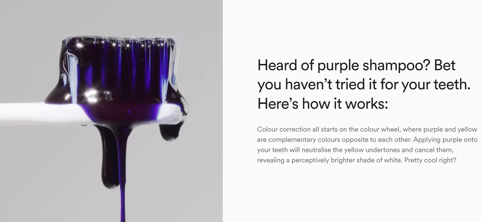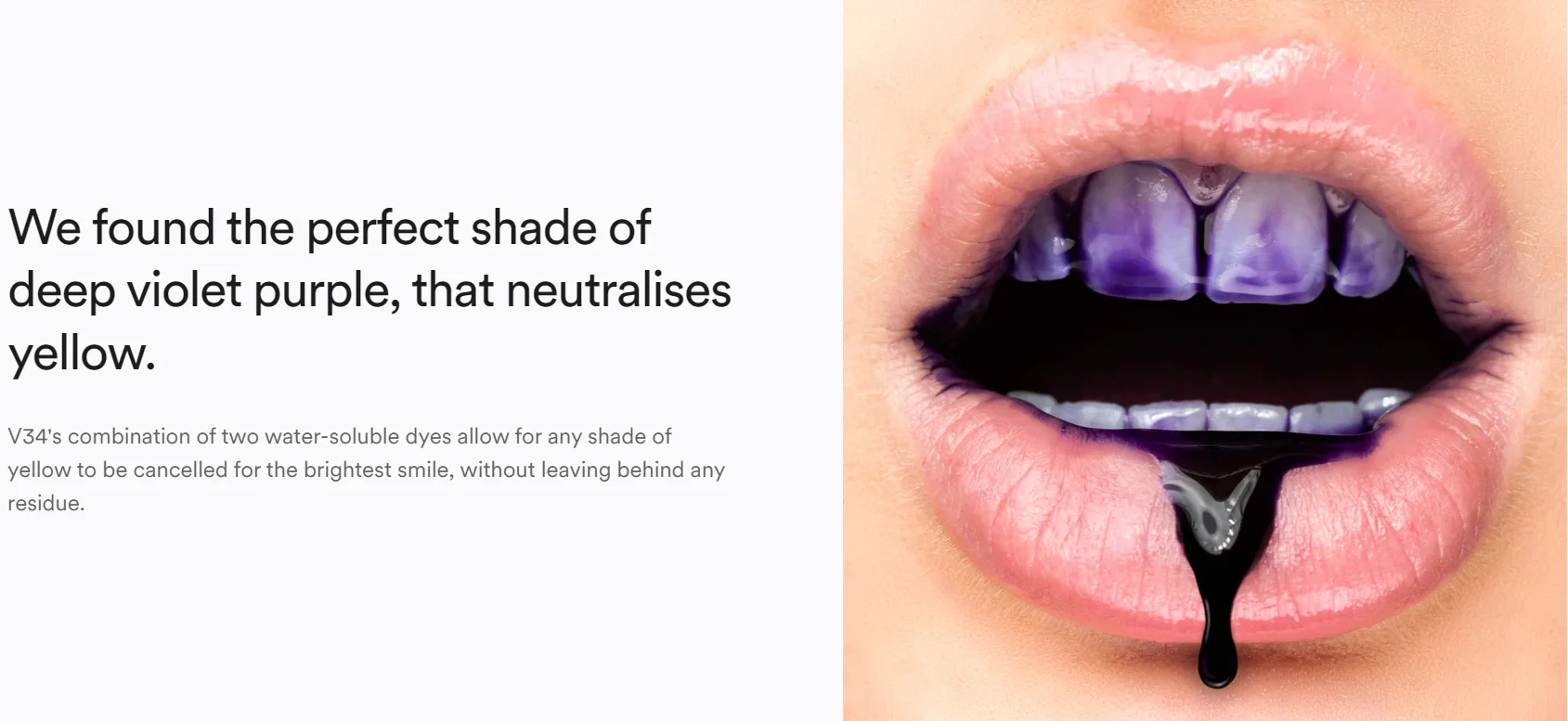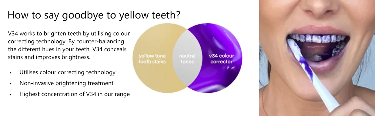 1.How does V34 work?Purple is directly opposite yellow on the colour wheel and is therefore its complementary colour, so a water-soluble purple dye is applied to your teeth to cancel out any yellow undertones.