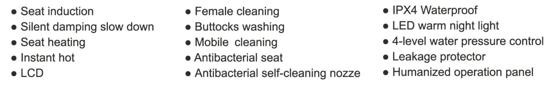 2.Constant temperature & Instant heat.No need to store water in a water tank for smooth washing to avoid bacterial growth.LED warm night light.Intimate night light, humanized design,soft and not dazzling.