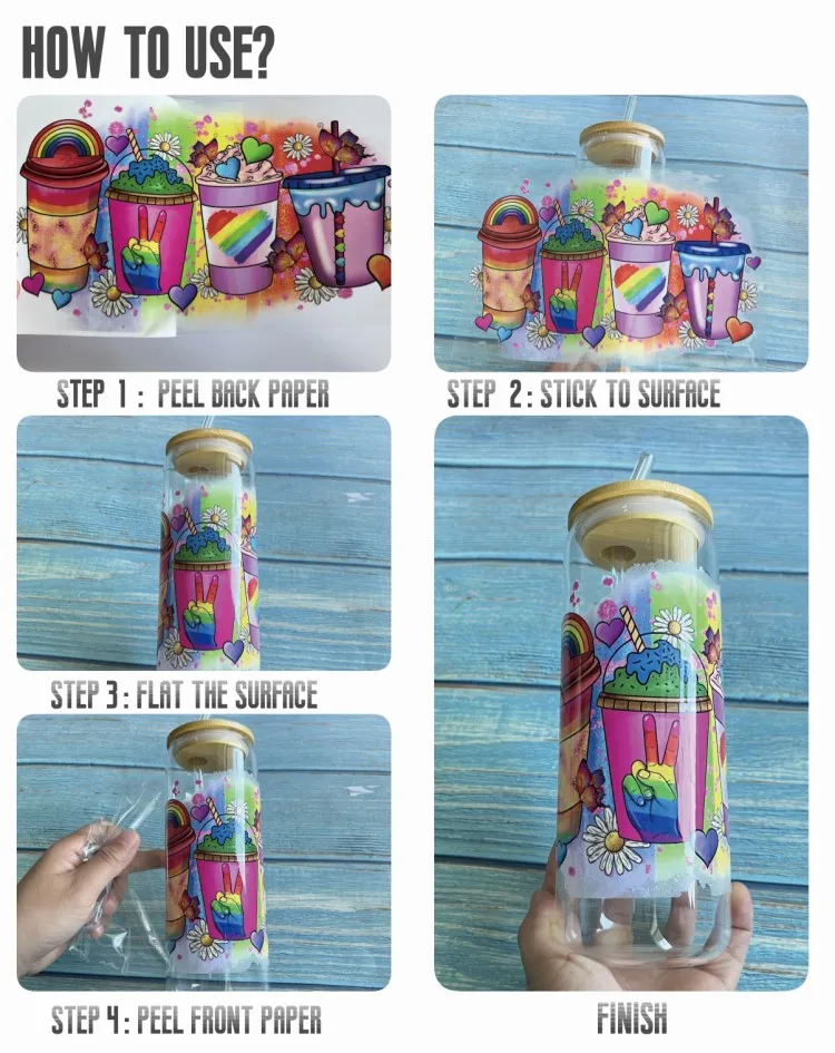 2.Versatile: UV DTF transfer stickers can be applied to a wide range of surfaces, including glass, metal, plastic, and paper. This makes them ideal for use on a variety of products, including promotional items, product packaging, and retail displays.