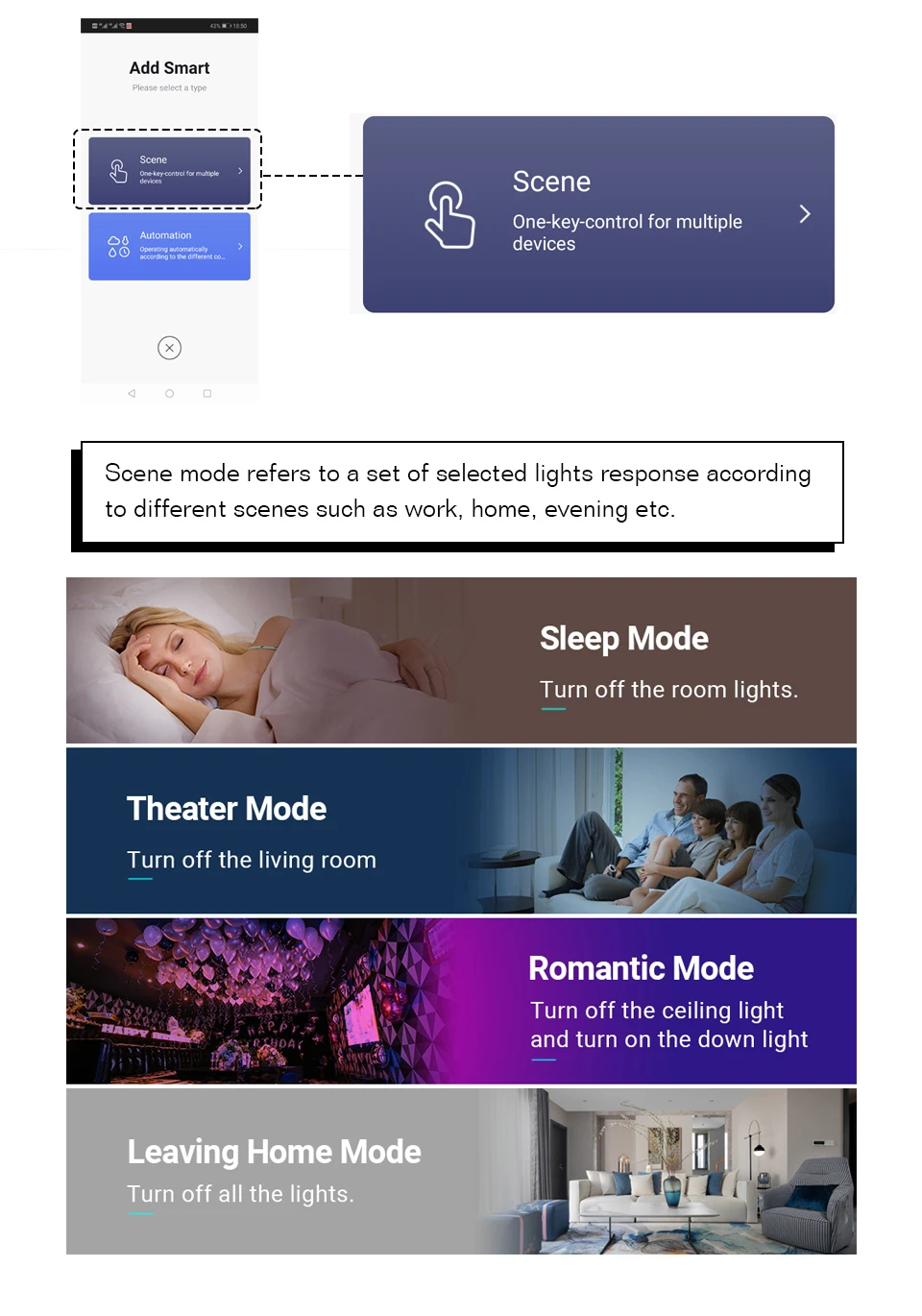 1.Smart App Remote Control:Conveniently control your lights with the free mobile "Smart Life"phone App no matter where you are.(Compatible with Android&iOS.)Also,you may easily share it with your family to control your lights together with Smart App.