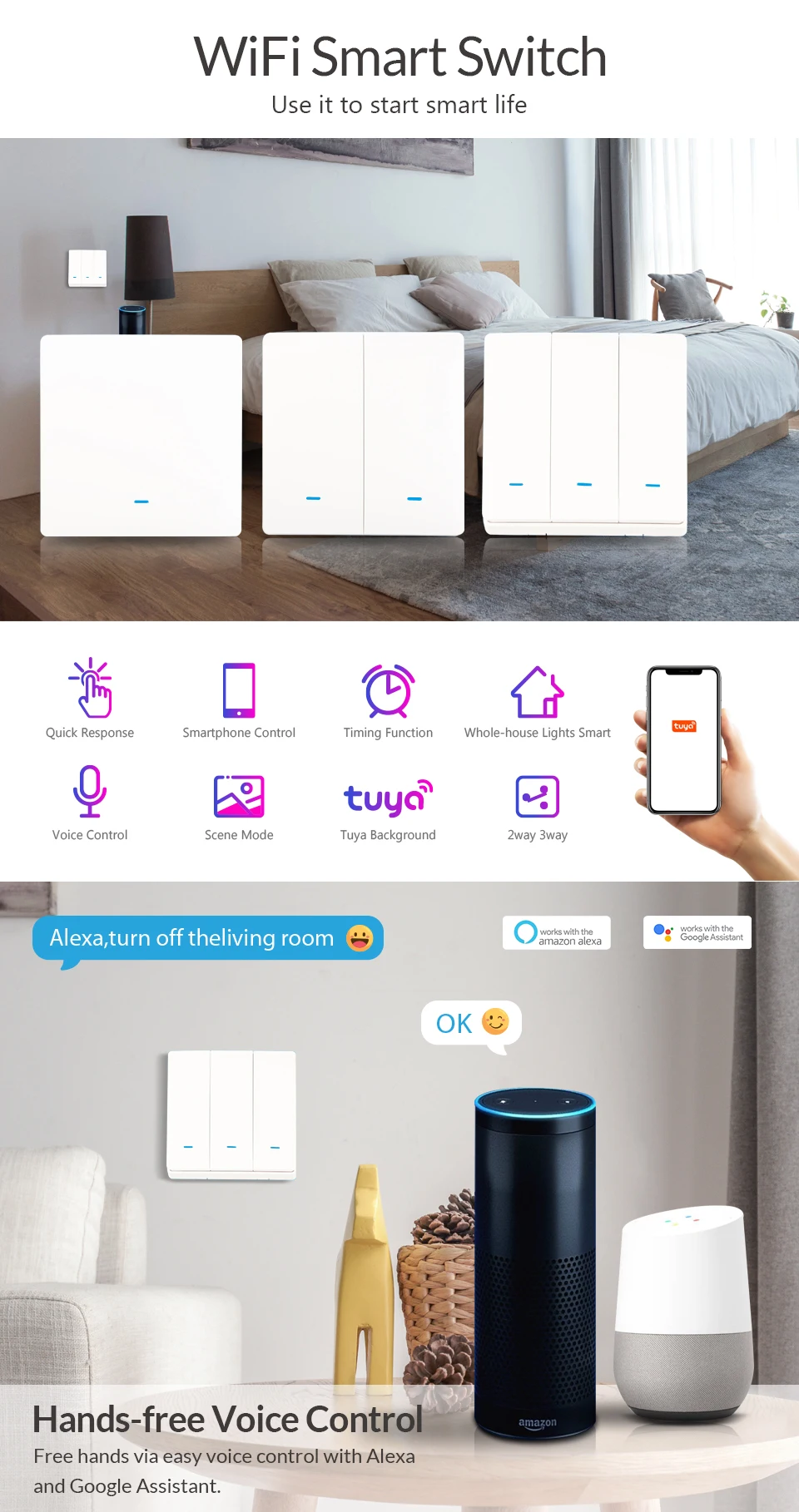 2.Hands-Free Voice Control:Compatible with Amazon Alexa and Google Home for easy voice control when your hands are not free,providing your smart life with much more convenience.