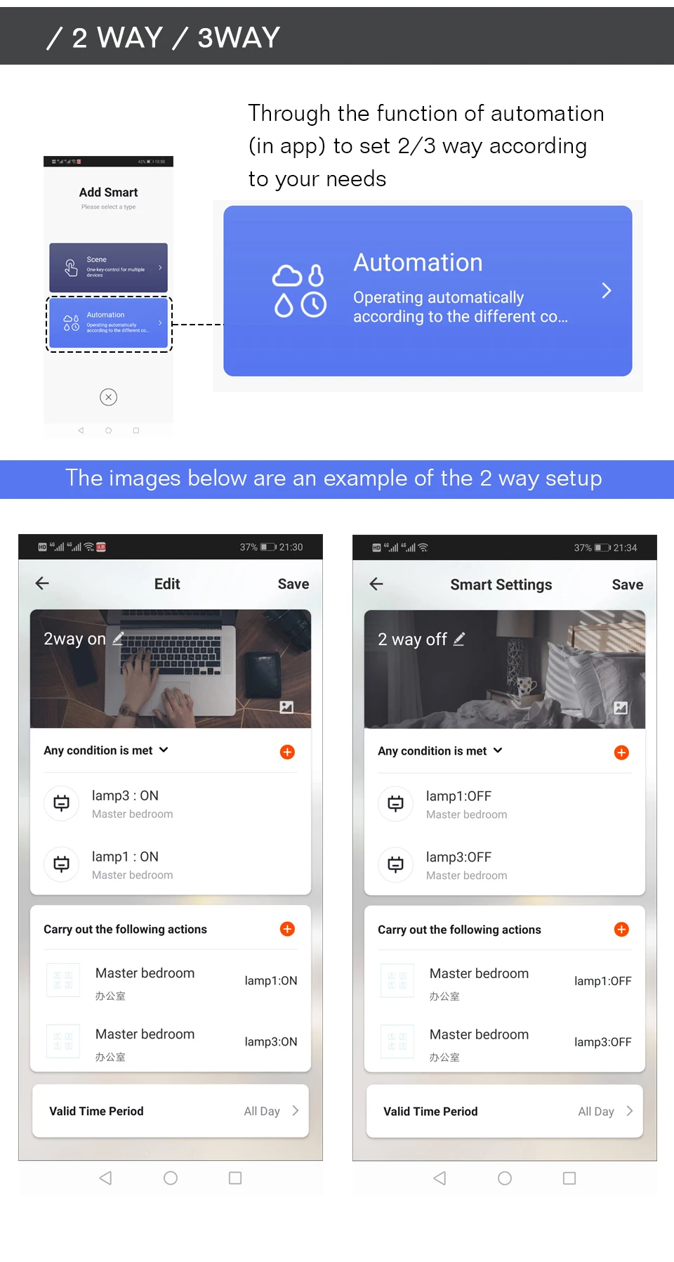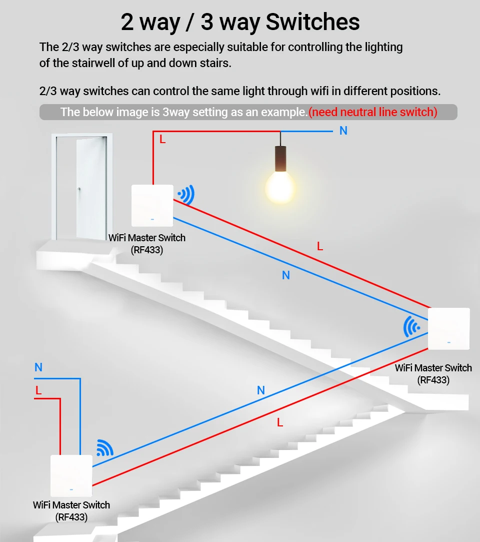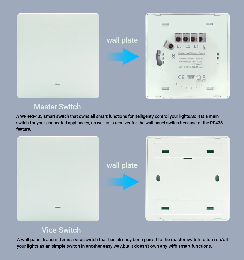 WiFi+RF433 Switch(Master Switch):A WiFi+RF433 smart switch that owns all smart functions for intelligently control your lights.So it is a main switch for your connected appliances,as well as a receiver for the wall panel switch because of the RF433 feature.