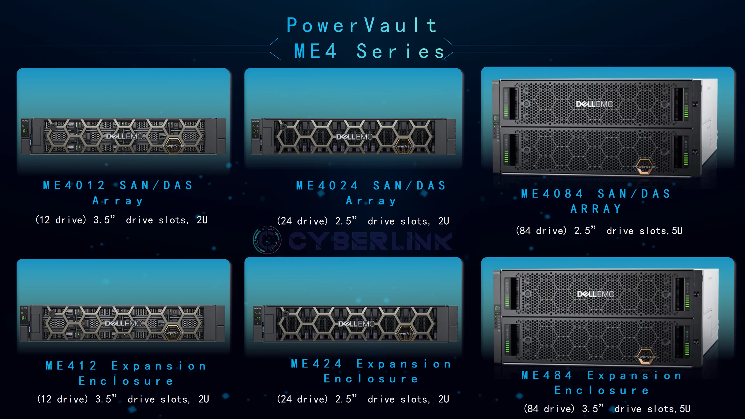Expansion enclosures | ME412: 12 x 3.5” drive bays (12Gb SAS) ME424: 24 x 2.5” drive bays (12Gb SAS) ME484: 84 x 3.5” drive bays (12Gb SAS) | |