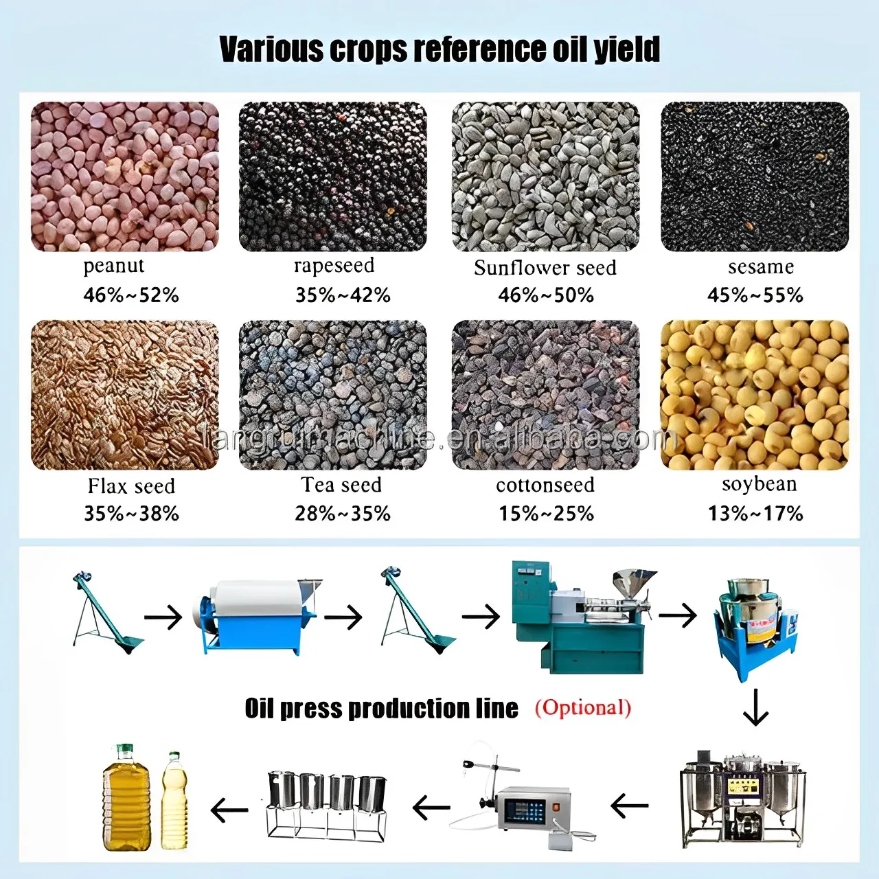 All kinds of oil seeds. For example of common oil material:soybean, rice bran, corn germ, cottonseeds, peanut, sunflower, rapeseed, palm fruit etc.