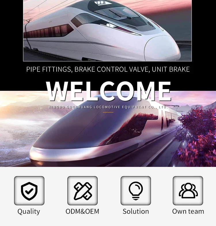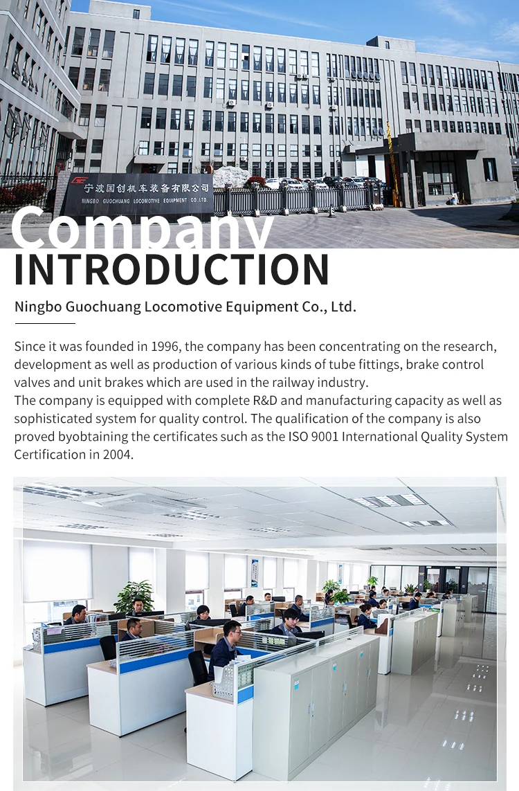 A:Ningbo Guochuang Locomotive Equipment Co., Ltd.Since it was founded in 1996, the company has been concentrating on the research, development as well as production of various kinds of tube fittings, brake control valves and unit brakes which are used in the railway industry.We are factory.The company is equipped with complete R&D and manufacturing capacity as well as sophisticated system for quality control. The qualification of the company is also proved by obtaining the certificates such as the ISO 9001 International Quality System Certification in 2004.