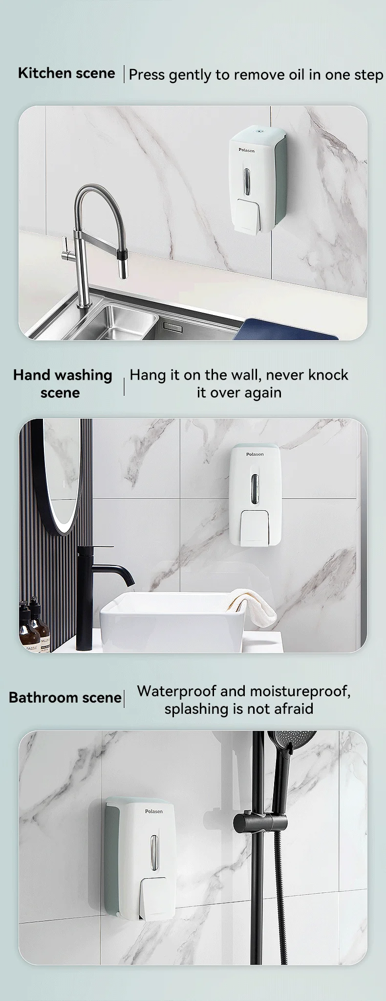 This minimalist designed soap dispenser is suitable for all kinds of bathroom/kitchen. It is very useful no matter for home or commercial places.