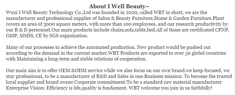 globel countries .Our main aim is to offer OEM &ODM service while we also focus on our own brand.we keep focused, we stay professional, to be a manufacturer of R&D and Sales in one.Business mission: To become the trusted loyal supplier and brand owner Corporate commitment:To be a standard raw material manufacturer Enterprise Vision: Efficiency is life, quality is fundament. WBT welcome you join in us faithfully!