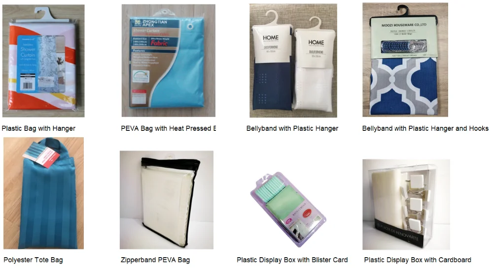 Package | 1. folded shower curtain with a white insert card 2. 12 C-shape plastic white rings 3. Custom design colorful card 4. Sealed Plastic bag with hanger |