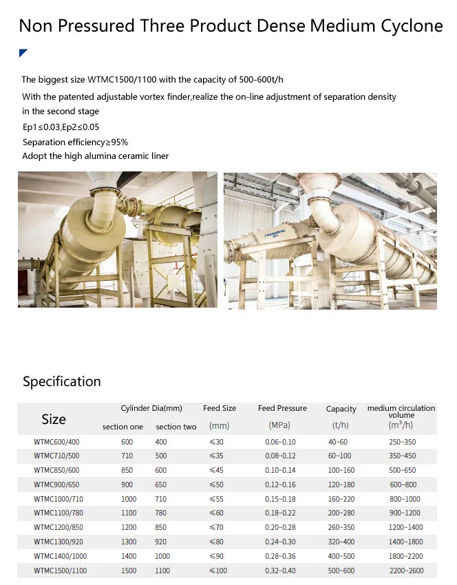 Specification | Diameter (mm) | Feeding size (mm) | Pressure (MPa) | Capacity (t/h) | Medium Circulation (m3/h) |