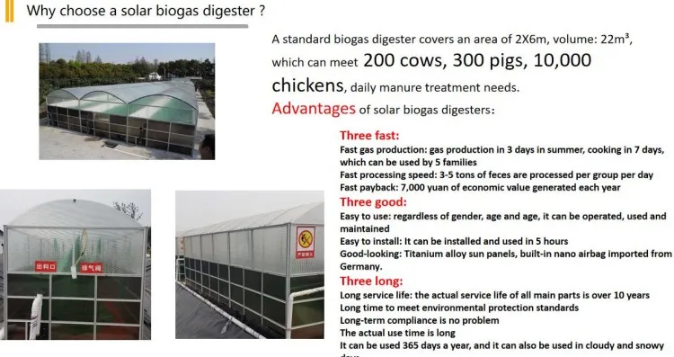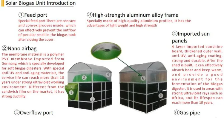 Portable assembled solar biogas digester is a high-efficiency biogas digester with industrial production and standardized packaging. It has quick installation, ready-to-use, no civil construction, no installation cost, can be moved at will, easy to use, easy to maintain, heat absorption and heat preservation to produce gas High efficiency, convenient transportation and low cost of folding packaging, strong structure, safe and beautiful and other advantages.