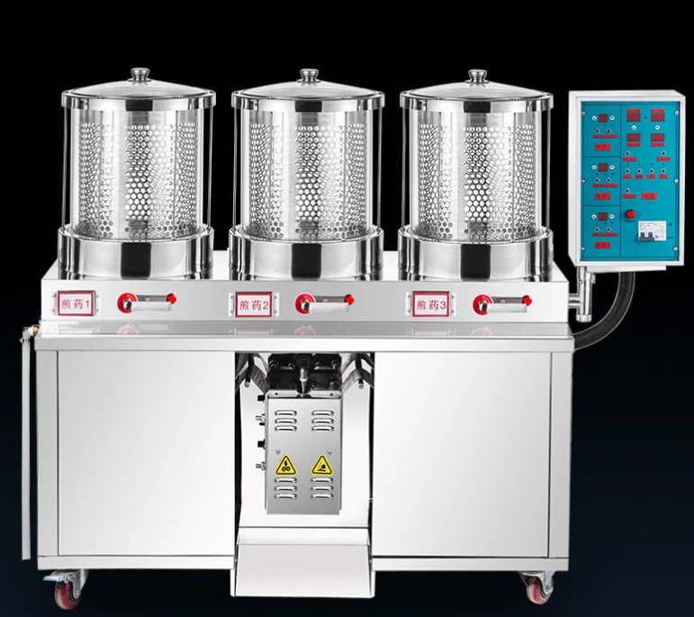 1. Integrated decoction packaging, compact structure, space-saving, beautiful and elegant, cylinderized plexiglass barrel body,clear decoction process at a glance 2. Applicable to hospitals, health centers, clinics, pharmacies, and drug stores. 3. room temperature decoction, can cook 3 or so prescriptions at the same time. Each pot can be fried 3-15 pieces of medicine. 4. computer program control technology, fully automatic operation; Wenhuowuhuo automatic conversion, decoction time automatic equipment, can be fried first, then the next. 5. liquid packaging specifications 50-290ML adjustable; four sides of the packaging bag automatic edge sealing, sealing technology. Safe, reliable, convenient and beautiful, not easy to leak liquid 6. Say goodbye to fire and smoke, reduce staff and increase efficiency, once and for all. Carry forward the development