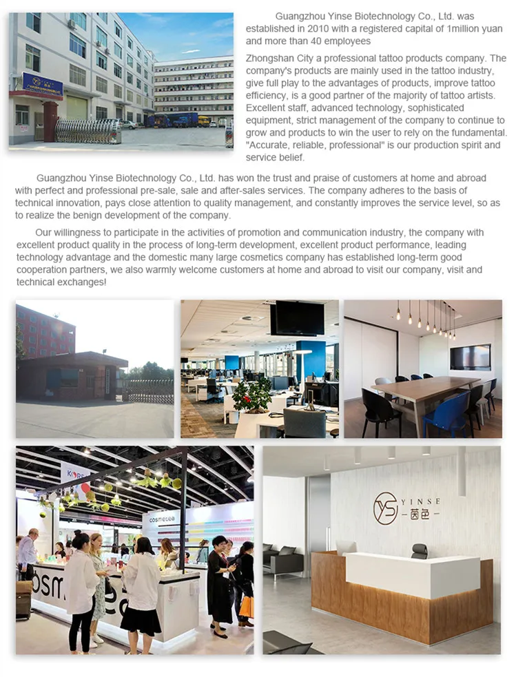 1.Q:Why should I choose Yinse Biotechnology as my supplier? A: For over 10 years experience in permanent comestic makeup tattoo supply, we offer you competitive price, stable quality goods and professional service of products, shippment and marketing