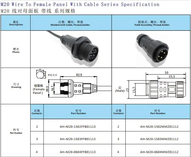 In order to save your processing time, we molded with cable once you can confirm the wire size and cable length. For the male connector, we can also help to make the solder with cable. Please note that the female plug is front panel mount, it mean that the hex nut is outside junction box.