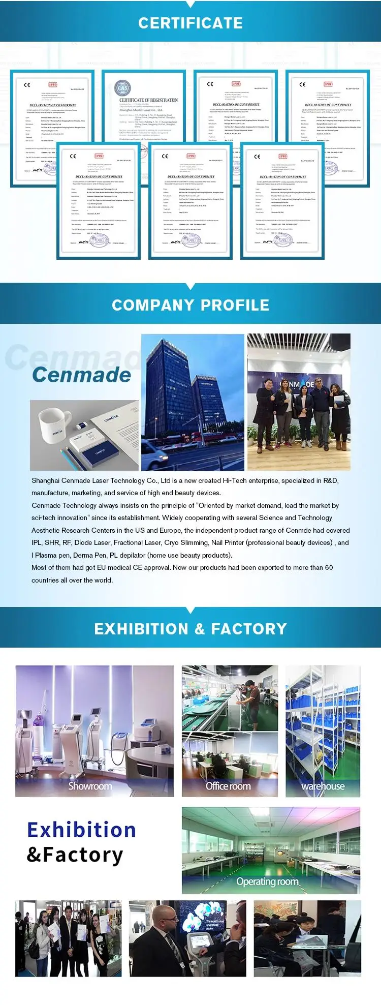 We have 10 years of R&D experience, more than 30 independent copyrighted products had been introduced to the beauty market ; With 9 years of manufacturing and 7 years of export experinence, more than 10,000 machines delivered to users all ove the world.