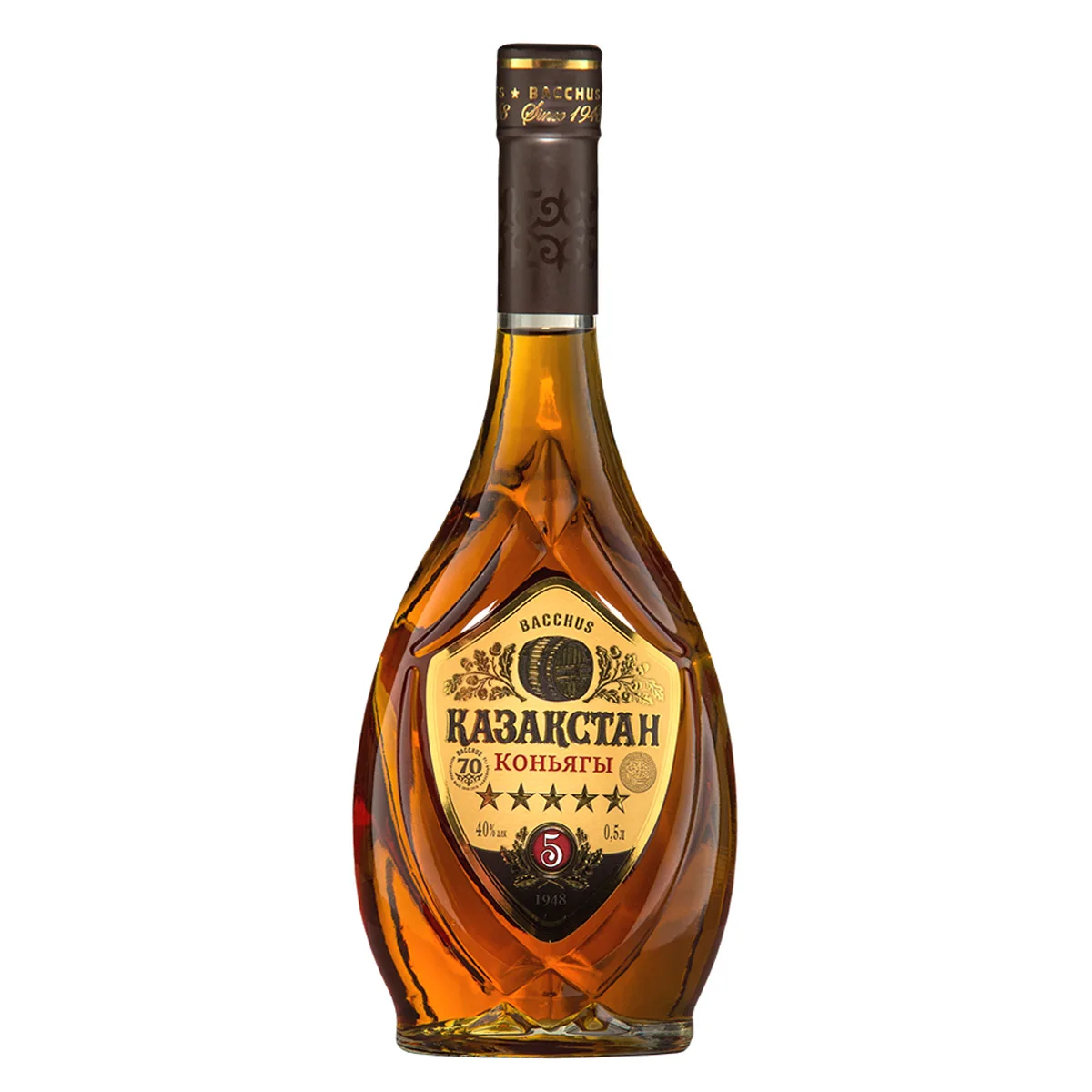 Five years old cognac "Kazakhstan" is made by the classic technology from distillates aged for five years in oak-staved vessels. Prevailing notes of oriental dried fruits in the bouquet, soft aftertaste.