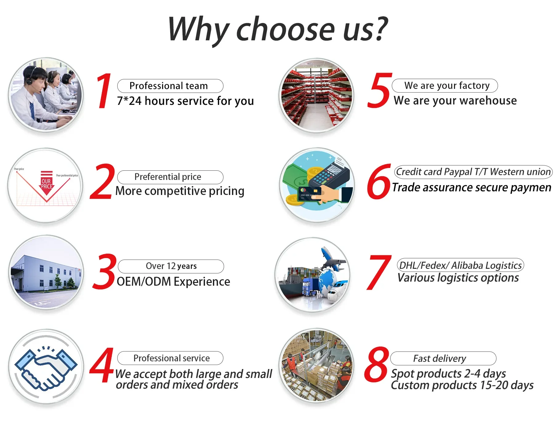 Payment methods: T/T, Western Union, Cash and PayPal(PayPal is accepted for sample order)is perfect!