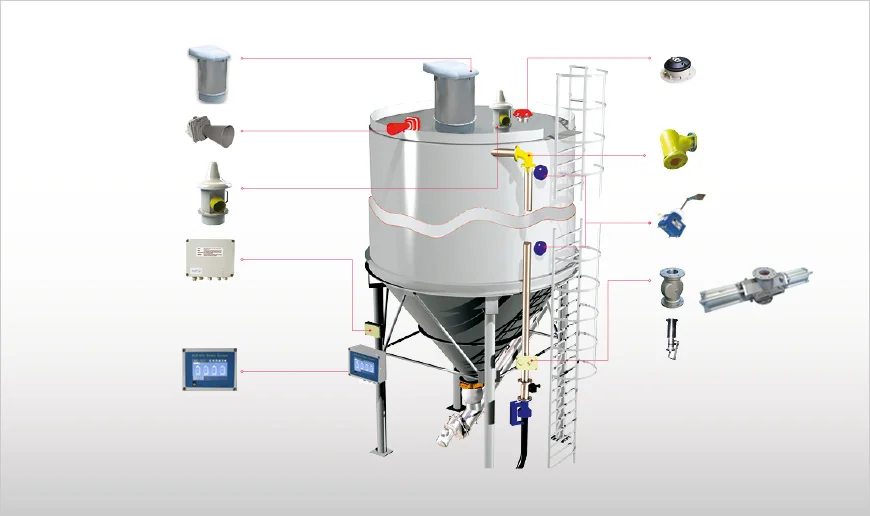 Dust collector ,Pressure Relief Valve ,Aeration System , Level Indicator ,Butterfly valve & Actulator, Vibrator ,Screw conveyor.