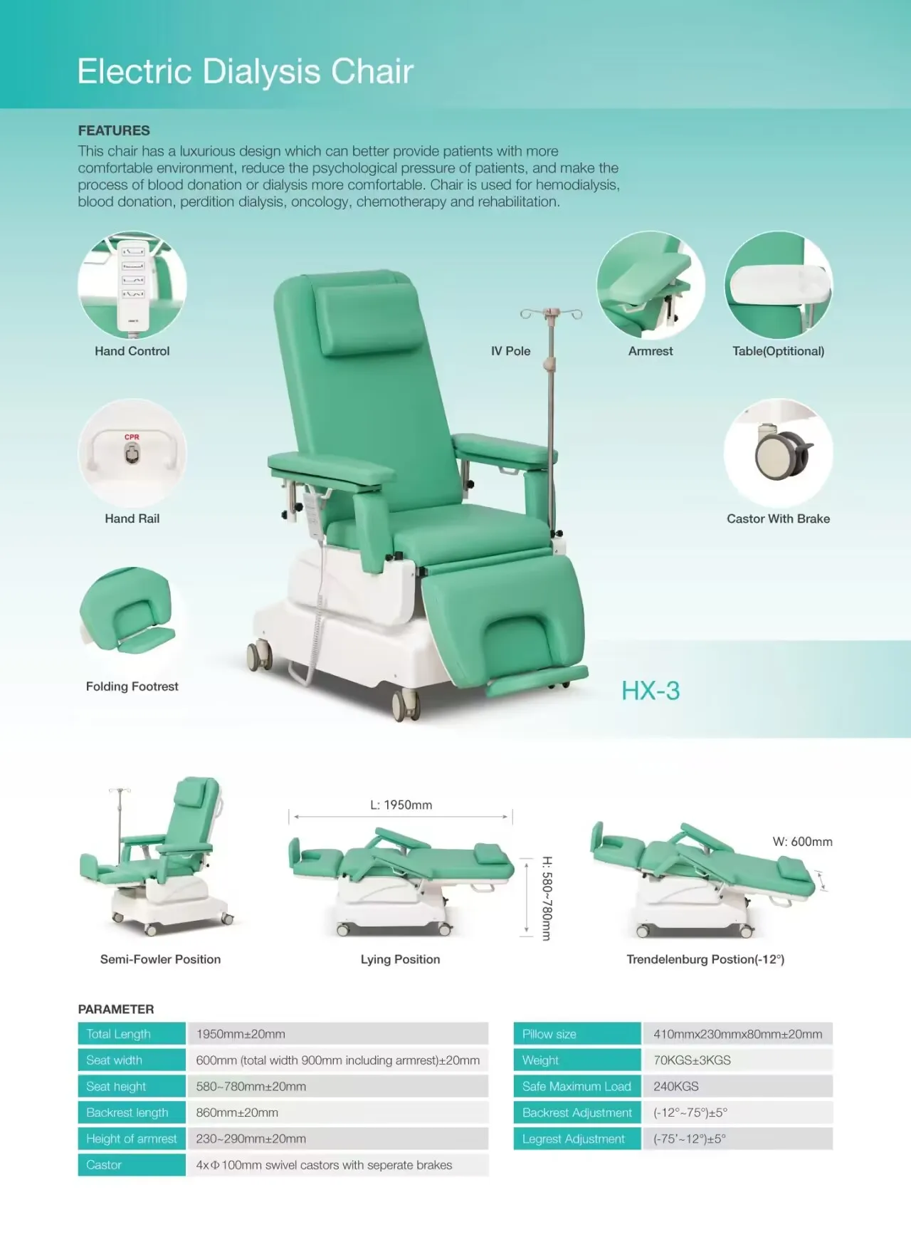Height of armrest | 230~ 290mm±20mm | Legrest Adjustment | (-75°~12°)±5° | ||