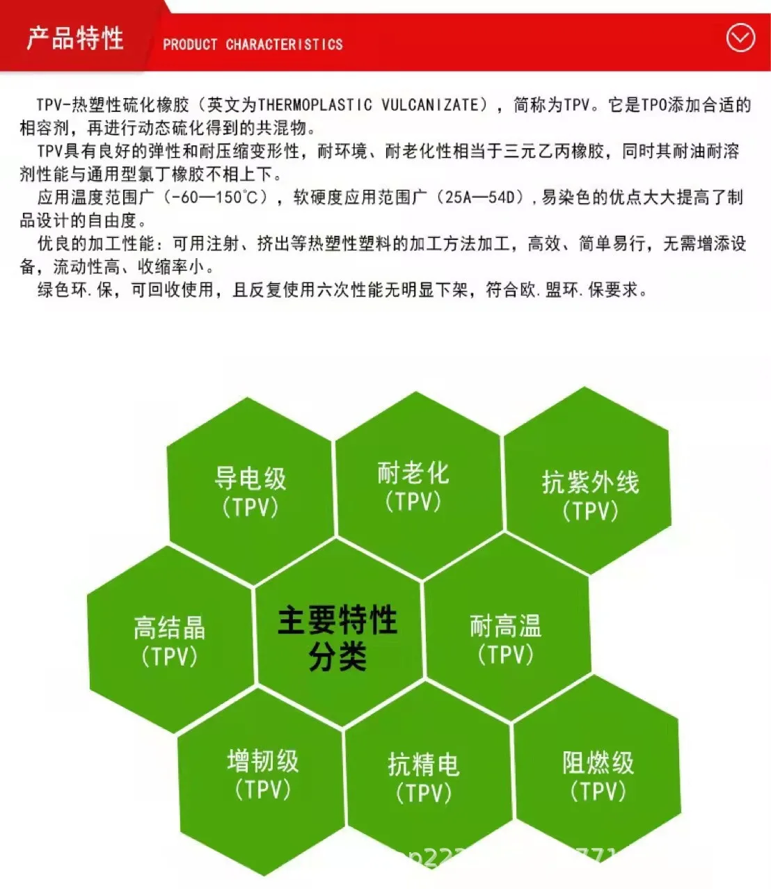 4. TPV does not require vulcanization when used, and can be directly processed and formed through injection, extrusion, rolling, blow molding, etc., which can shorten the processing process and reduce processing costs;