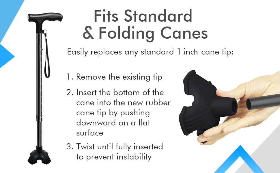 Compatible with standards and folding caps: Easily suitable for any standard 1 inch sugar cane. Simply remove the existing tip and insert the bottom of the standard or folding crutches into the new rubber sugar cane tip, drive down the flat surface and twist until completely insertion to prevent instability.