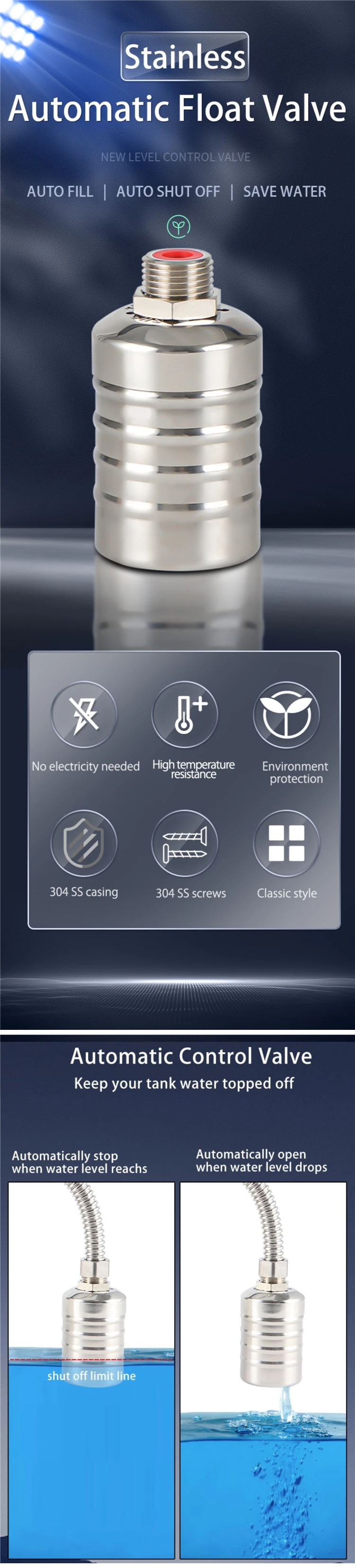 [Auto function]The float valve automatically refills water for your water tank,water tower,livestock,animal water drinker when water drops below the valve level. Once it reaches the valve, it would automatically stop refilling water,so it will shut-off when the water reaches the internal float.