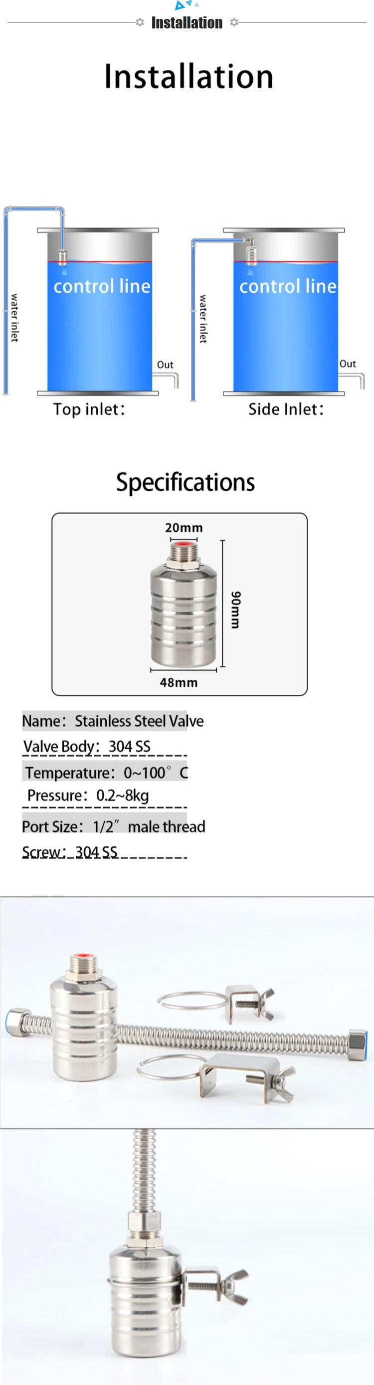 [Easy to install]It''s a mini float valve,ball size is small,so easy to install,the male thread is 1/2 inch, we used BSP pipe thread,also the male thread is longer,it''s perfectly to fit most of BSP thread connections. If your pipe thread is NPT,you just need to add a few PTFE TAPES on the male thread,then it works perfectly as well.