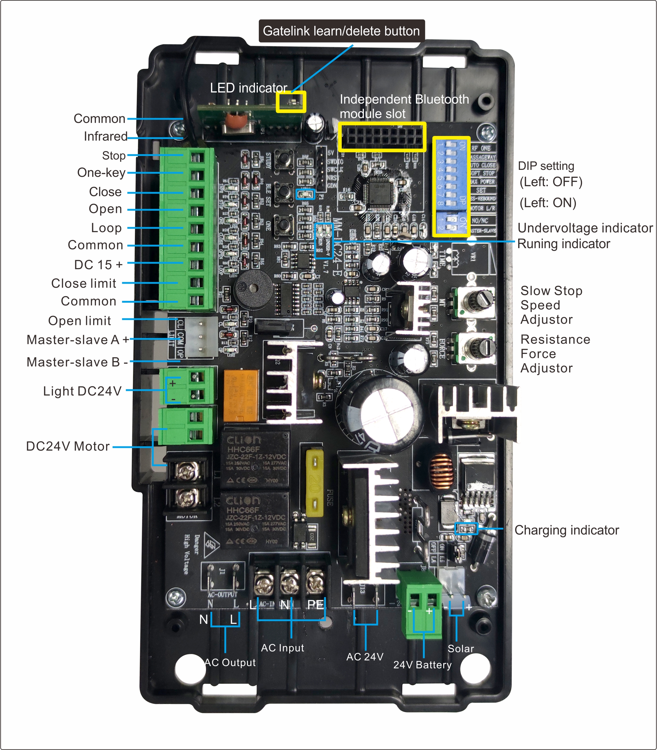 Hold down the STUDY button on the control board for about 1s until a buzz, then hold down any button among UP, DOWN, STOP on the