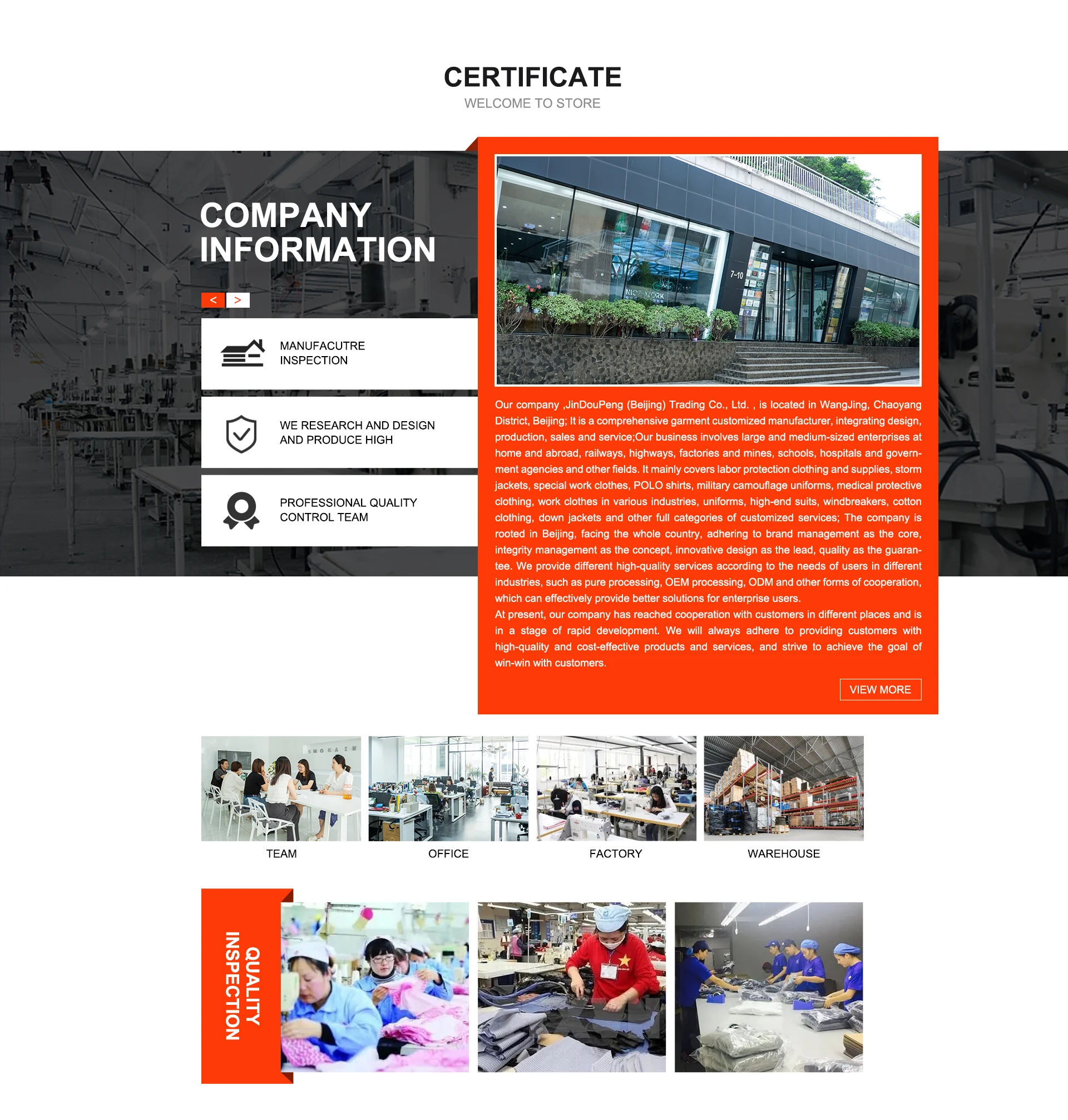Our company ,JinDouPeng (Beijing) Trading Co., Ltd. , is located in WangJing, Chaoyang District, Beijing; It is a comprehensive garment customized manufacturer, integrating design, production, sales and service,sell to Domestic Market(10.00%),South Asia(10.00%),Northern Europe(10.00%),Central America(10.00%),Eastern Asia(10.00%),Mid East(10.00%),Africa(10.00%),Southeast Asia(10.00%),Eastern Europe(10.00%),South America(10.00%),North America(10.00%). There are total about 150 people in our office.