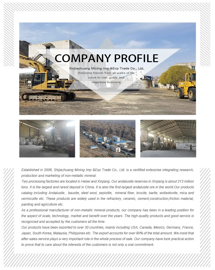 Shijiazhuang Mining Imp & Exp Trade Co., Ltd. established in 2008, and owns the sepiolite mine,vermiculite mine and andalusite mine etc.