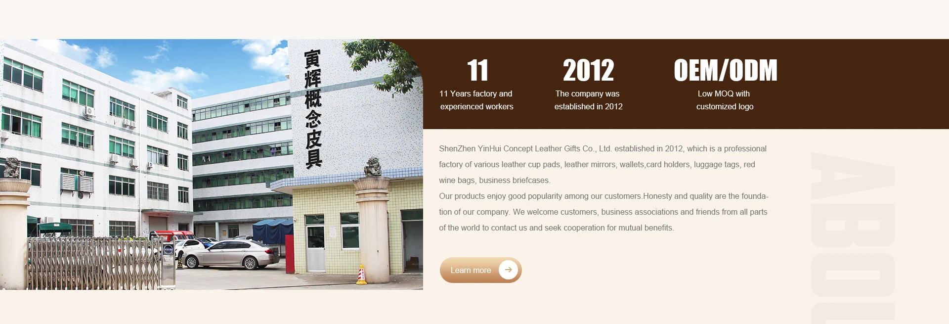 ShenZhen YinHu Conceot leater Gits Co.Ltd. estabished in 2012.which is a proessional factoy of varous leather cuo pads. leather mirors. walets card hoiders
