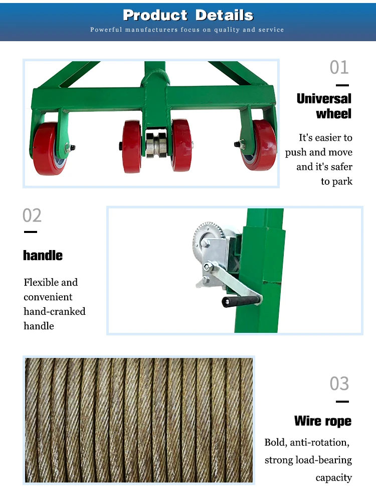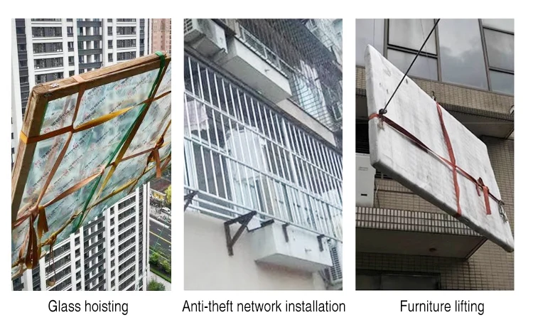 Scope of application: glass hoisting, air-conditioning external machine, marble, sofa, and other items that cannot be accessed bythe elevator Automatic braking after power failure, the braking system adopts electromagnetic external braking, and if the power supply issuddenly cut off, the slow-down function can be performed by breaking the brake lever, which can put down the items hoisted in theair. |