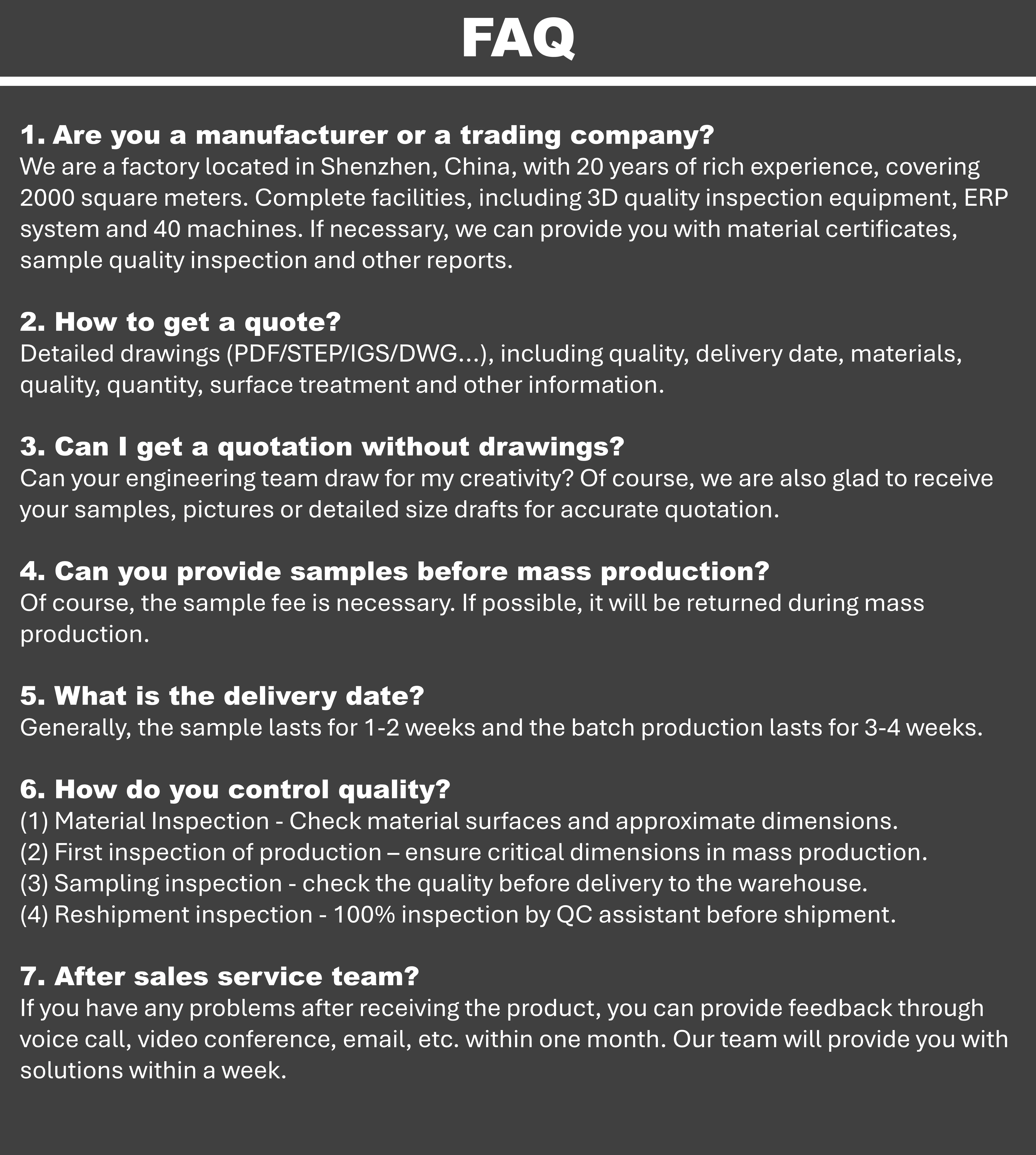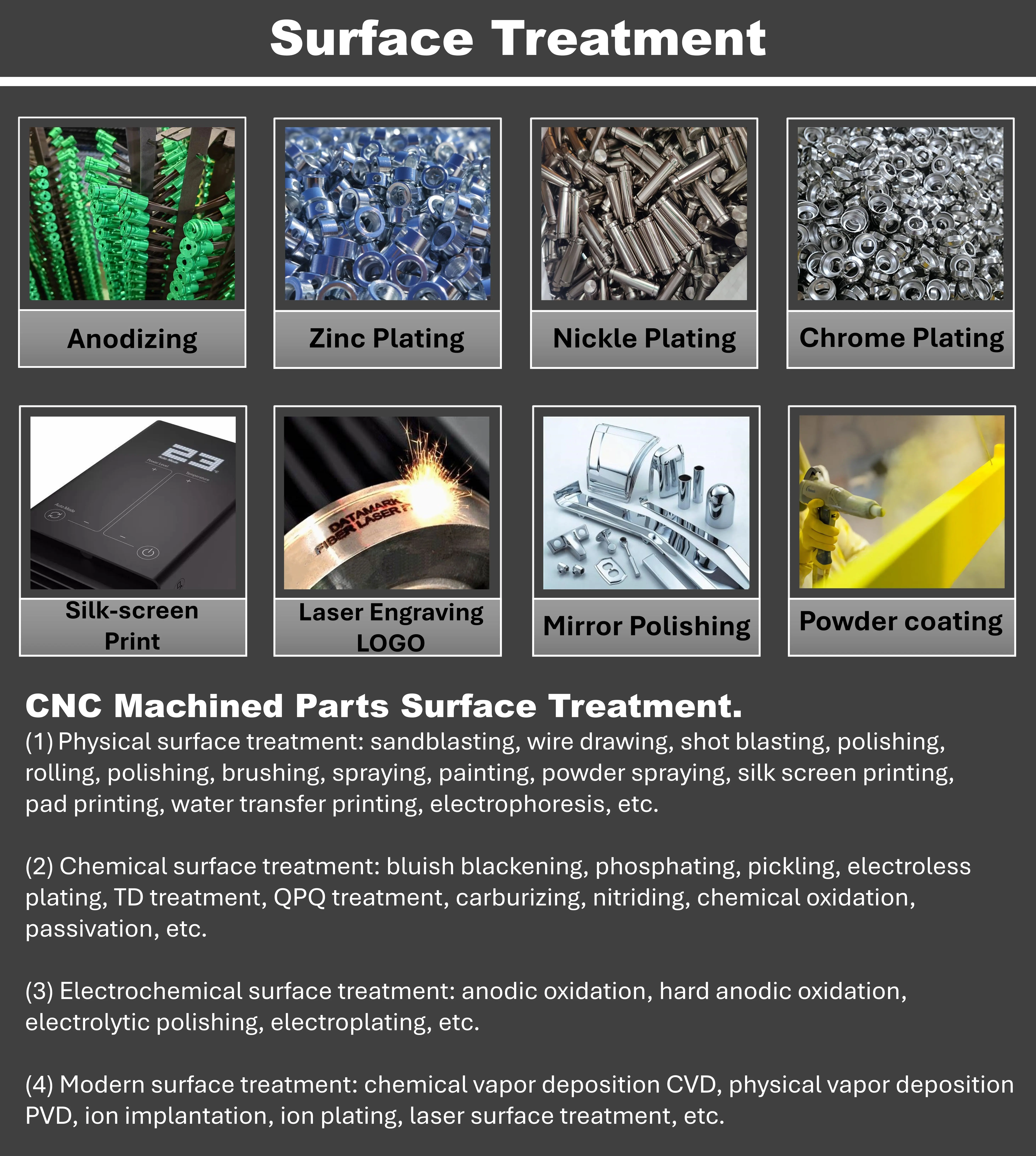 Surface Treatment | Anodized, Bead Blasted, Silk Screen, PVD Plating, Zinc/Nickl/Chrome/Titanium Plating, Brushing, Painting, Powder Coated, Passivation, Electrophoresis, Electro Polishing, Knurl, Laser/Etch/Engrave etc. | ||||||