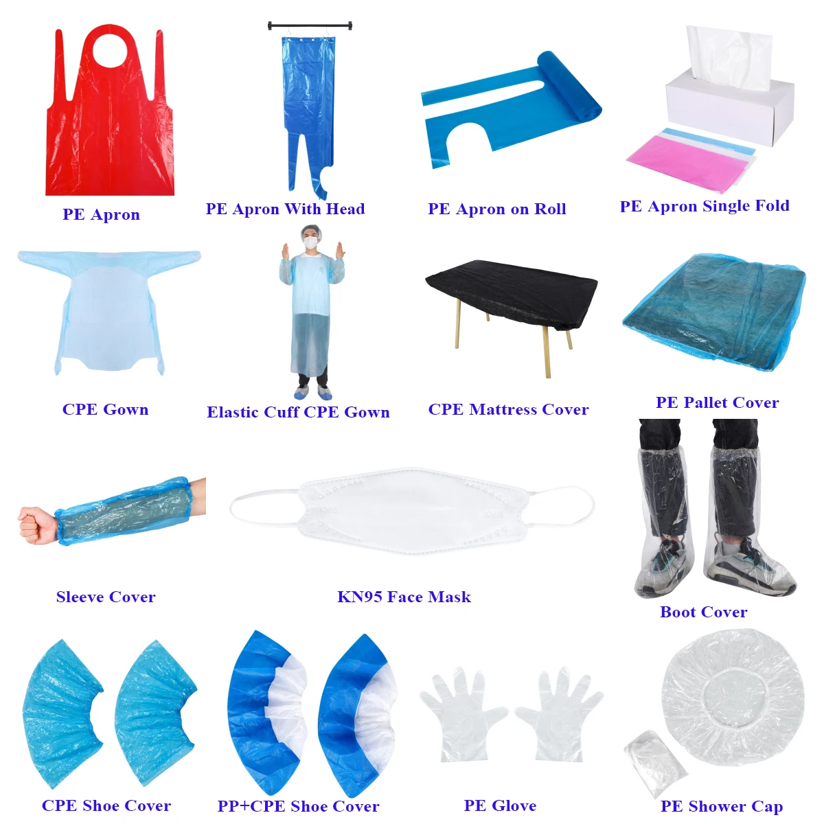 Our company is a professional manufacturer, and produces and exports products, including all kinds of plastic and non-woven products. Plastic products include aprons, gloves, cuffs, bedcovers, shoe covers, visiting takes, shower caps and others. Non-woven products include aprons, shoe covers, sleeves, round hats, hair cover caps, work caps, single or double 3 ply masks and other products. They are applicable to various industries, such as anti-labor area, health, electronics factories, food industry, beauty care, decoration works, hardware industry, clean care and home life.