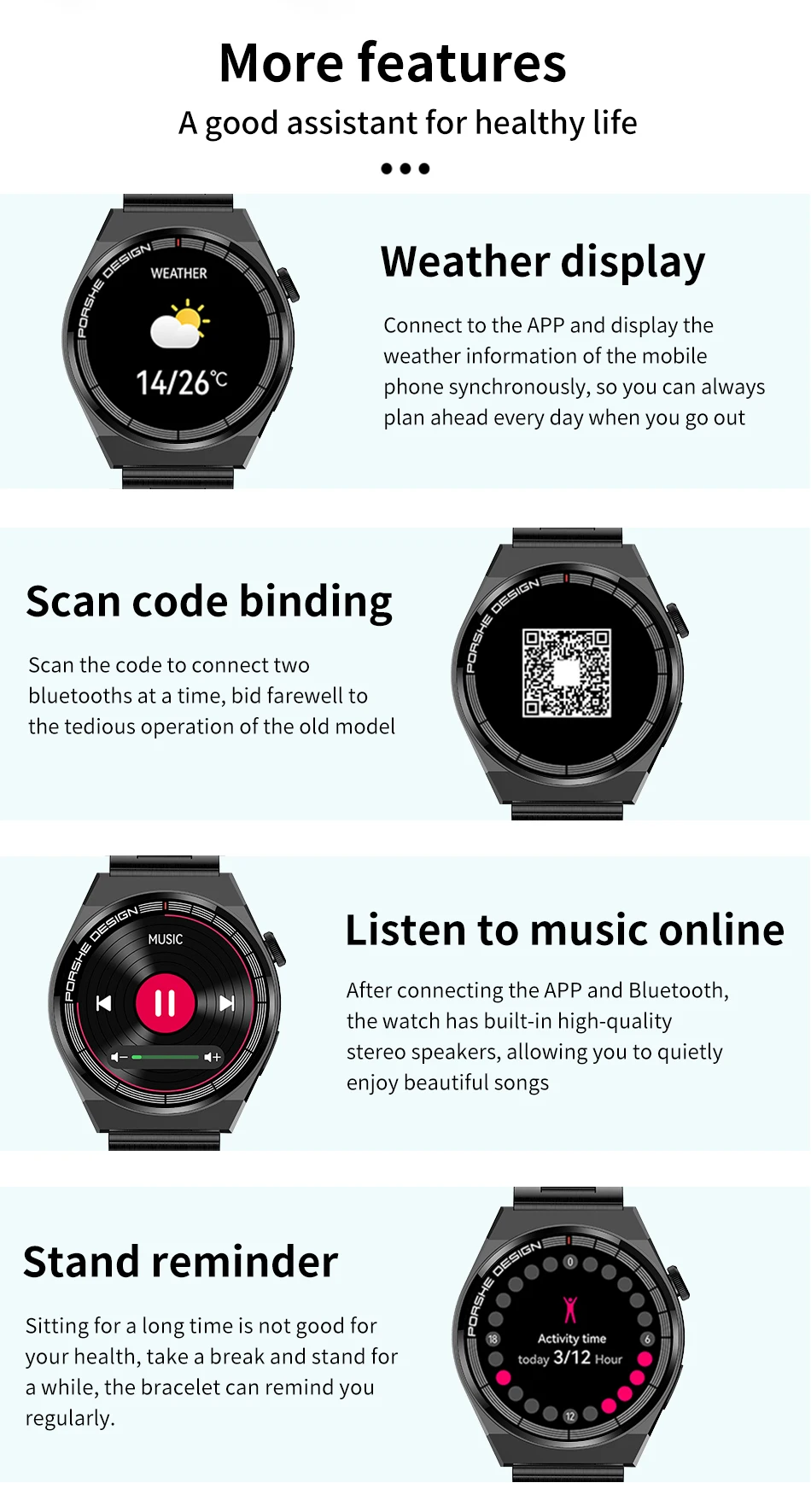 Function | Passometer,fitness tracker,Message Reminder,Call Reminder,Answer Call,Dial Call,Push Message,Big Three Needles,24 hour instruction,Chronograph,Alarm Clock,Small Second,World Time,Permanent Calendar,Power Reserve,week,Month,Heart Rate Tracker,Interactive Music,Calendar,Calculators | ||||||