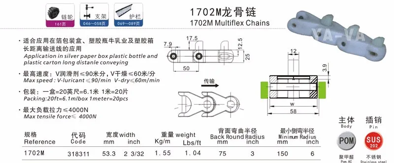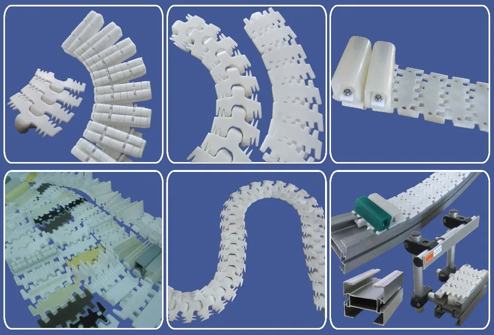 our company professional making different type of top chain for different customer, width is normally for 63.5mm to 609.6mm (2.5inch to 24inch).besides our normal size, we can accept talor made, this kind of plastic conveyor chain can be widely used in high speed curve conveyors in food industry, dish conveyor,bottle and can gripper climb machine,silver paper box and silver paper beverage package conveyor.