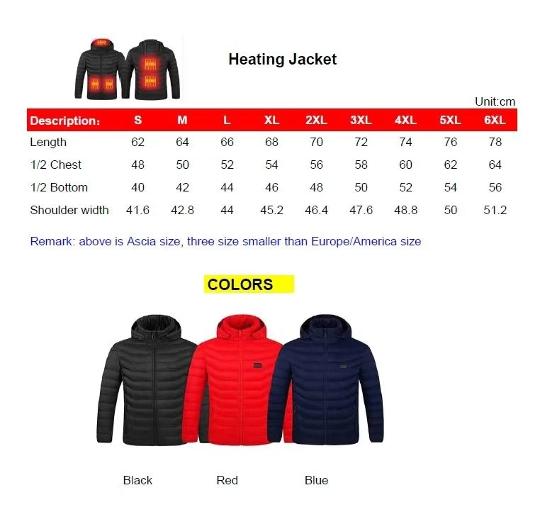 Highlights: | 1. USB charger double switch heating jackets 2. 2/4/8/9/11/13/15/1921 heating areas are available 3. Detachable hood design 4. Three-gear temperature control intelligent heating 5. Far infrared carbon fiber heating piece 6. Ultra lightweight:total 0.7kg, easy for carry to anywhere |