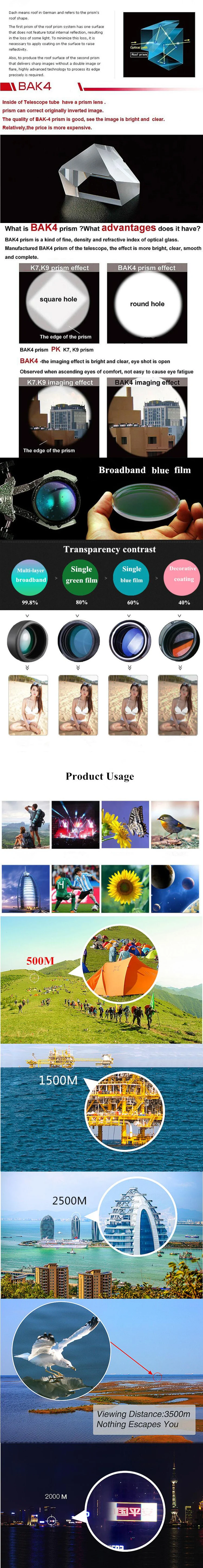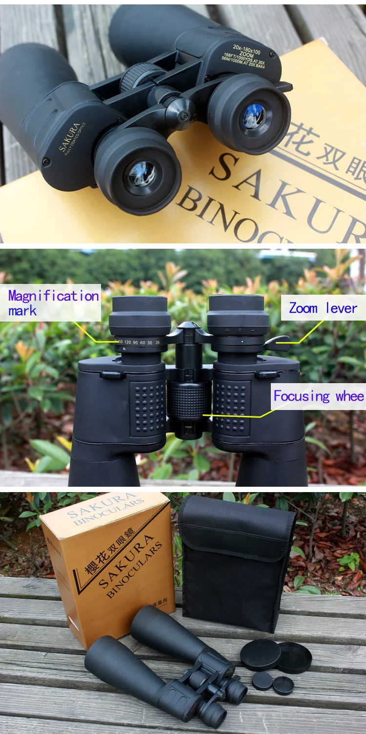 Color: Black Pack Size: 258mm x 138mm x 330mm Objective lens diameter: 70mm Brightness: 25.00-15.25 Twilight factor: 22.36-39.80 Type: Binoculars Quantity: Kit Features: Good quality, long service life. Professional design. Bak4 prisms. 20-180x100 zoom magnification. Multi coated optics. Coated lenses. Dioptric correction. Smooth centre focusing. Rubber armoured water resistant housing. Package Content: 1 x Binoculars Kit Note: Due to the difference between different monitors, the picture may not reflect the actual color of the item.1cm=0.3937inch