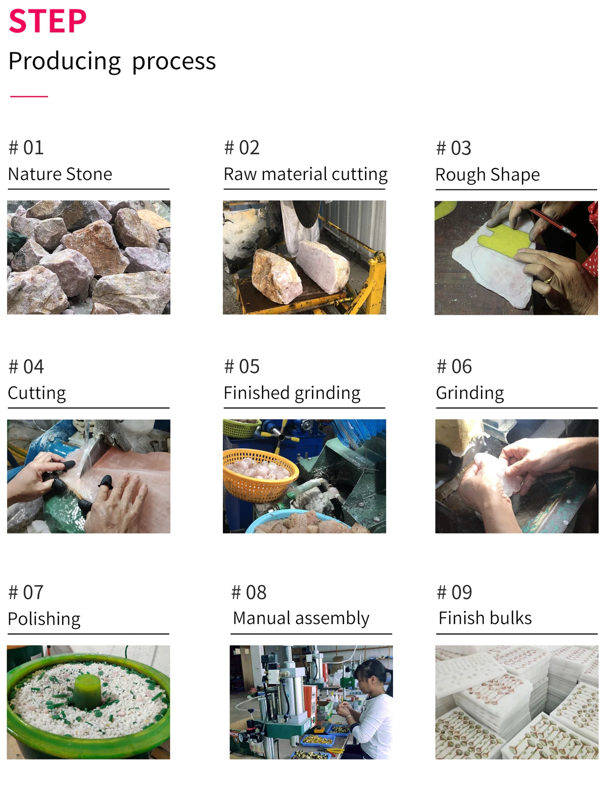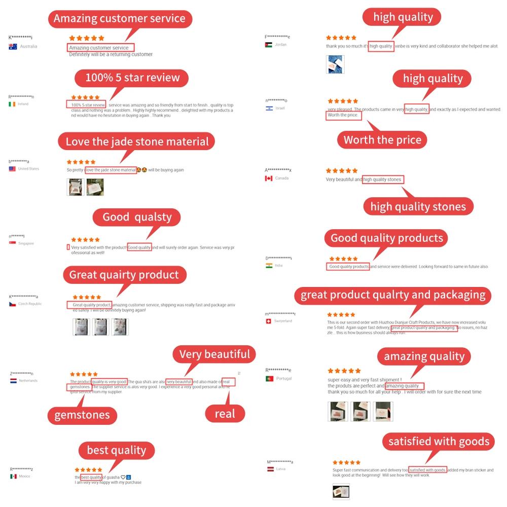Q: Are you a Factory Or Trading Company? A: yes, we are the original stone manufacture,we are business beauty and healthy produce with full experience since 2000. Q:Where is the Raw Material comes From? A: we offer the best quality quartz/crystal raw material which is imported Brazil Q:Is the same Color for all products? A:As the raw materials are comes natural stone, the color and the size with different of same model will be 1-2% which Cannot match all the same. Q:Is the All Size are Same? A: That items are hand-made by workers cutting, polished, with different engineer, the shape and size will exist error which is acceptable. Q: How was the products looks like when we got it? A: As the raw materials are comes natural stone, it would be exist natural yellow line, black point, scratch and internal structural texture; but not effect that functions. Q: Can we change the product color and Engrave our logo on the product or Print the customized box? A:yes, but with MOQ start on. |