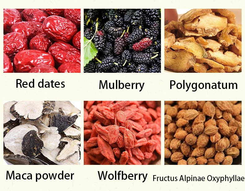 Ginseng, sealwort, maca, wolfberry, Eucommia male flower, mulberry, raspberry, black bean, poria cocos, Gorgon fruit, orange peel,licorice