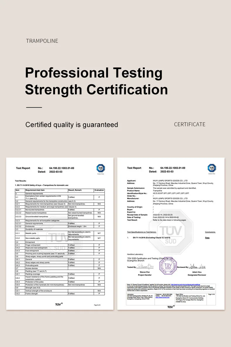 A: Our products are strictly manufactured according to the highest quality standards of European and American markets. Raw materials are certified by ASTM, TUV, CE.