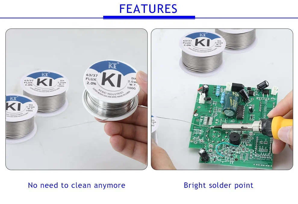 KWSW-505 | Sn50Pb50 | 183-216C | 0.8/1.0/1.5/2.0/2.5/3.0/3.2mm | 10g/50g/75g/454g/500g/800g/1kg | Some normal electronics, like: home appliances, electrical instrument, hardware, etc. |