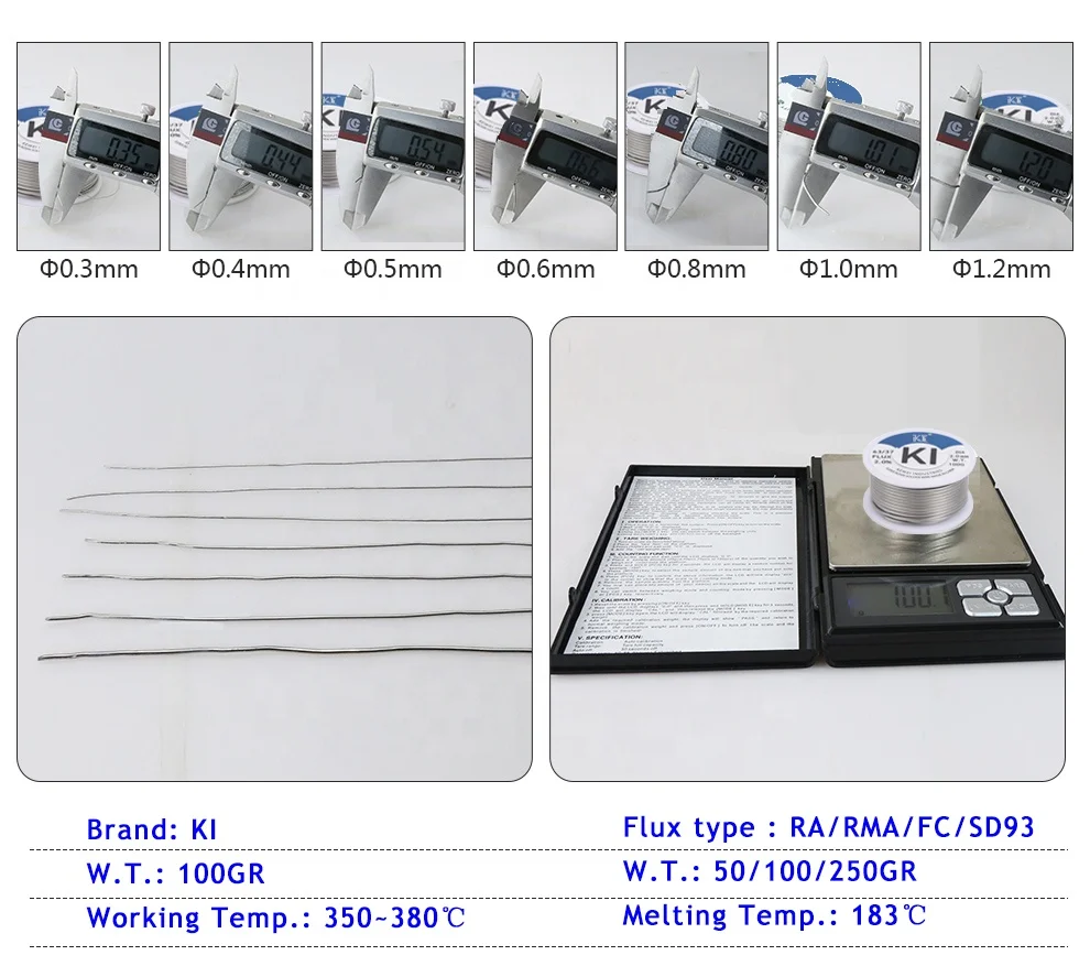 KWSW-603 | Sn63Pb37 | 183C | 0.8/1.0/1.5/2.0/2.5/3.0/3.2mm | 10g/50g/75g/454g/500g/800g/1kg | For High precision PCB, like: Communication electronic, Micro electronic, aerospace industry, etc. |