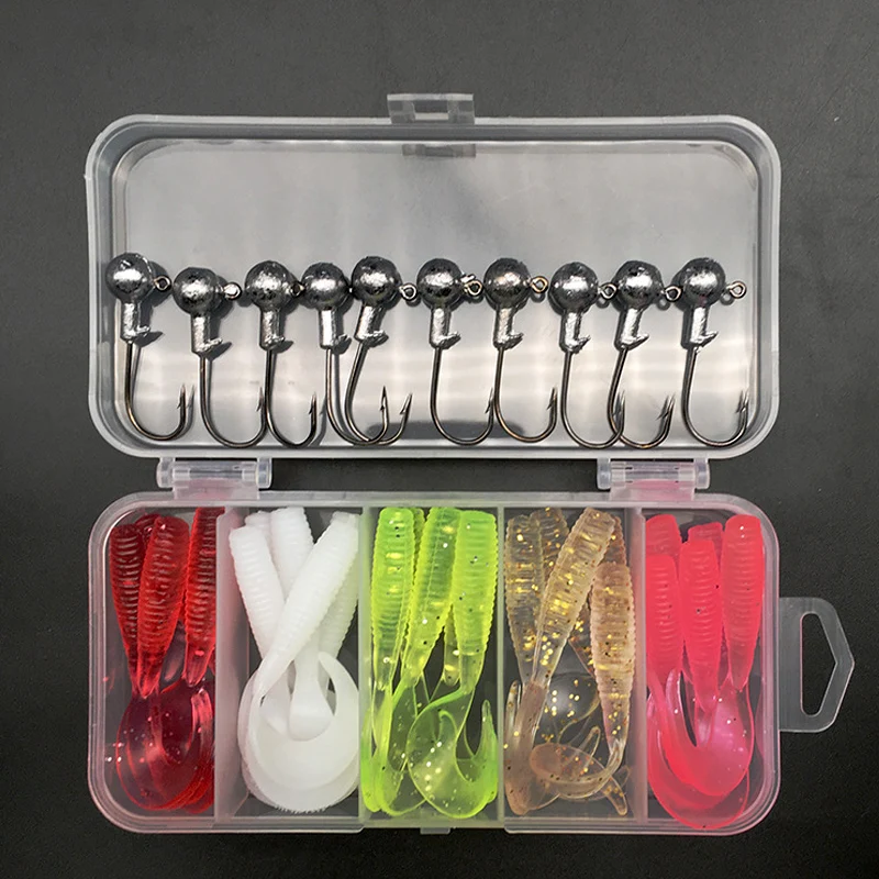 14.60pcs lure set Including:5cm Roll Tail--20pcs,5cm T Tail--20pcs 3.5g lead jig head-20pcs Box size:13*6*2.5cm Box weight:About 143g