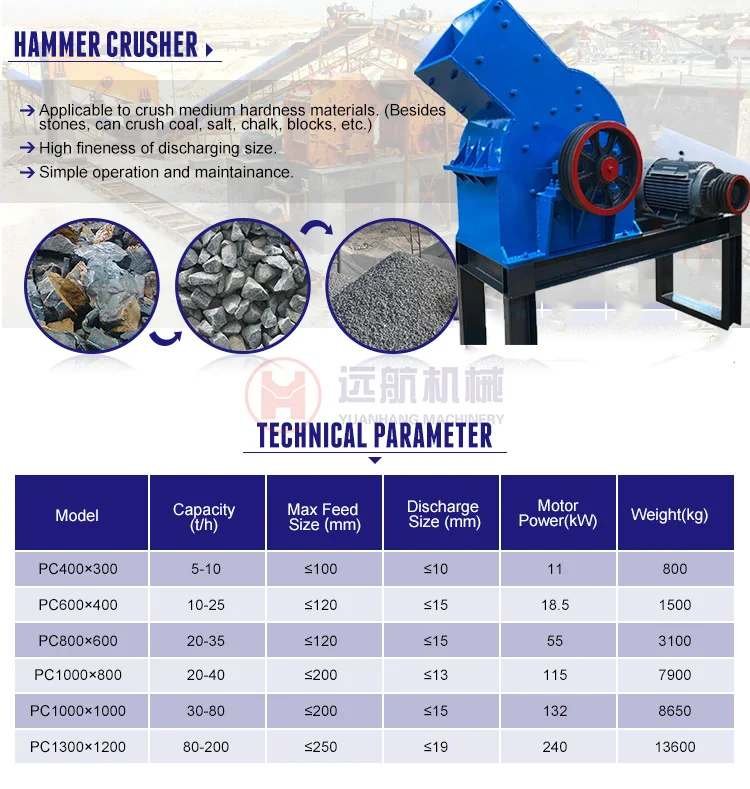 Hammer Crusher machine is suitable for crushing medium-hardness materials such as limestone, slag, coke, coal and so on in cement,chemical, electric power, metallurgy and other industrial departments. It has the advantages of simple structure, large crushing ratio and high production efficiency, which can break both dry and wet forms.