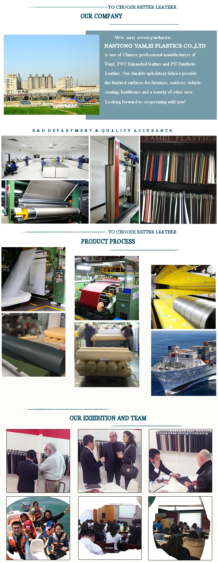 YAMEI is one of Chinese professional manufacturers of Vinyl, PVC Expanded leather and PU Synthetic Leather. Our durable