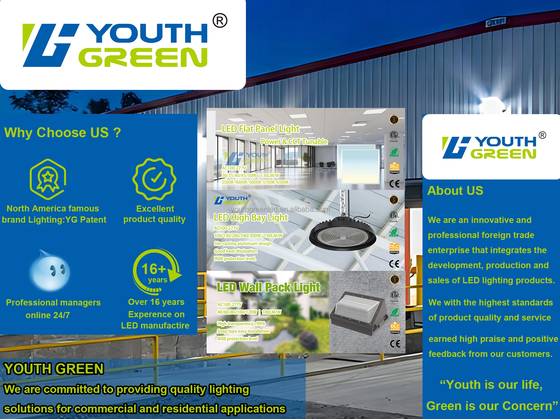 YOUTH GREEN: Yes, As a professional LED lighting supplier, we have excellent teams who focus on product development & design,quality control & inspection and company running, focusing on North America since 2013.Q4. Do you have any MOQ limit for led light order?