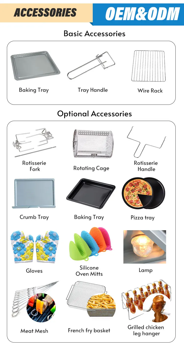 Bassic Function | 1)Bake/Toaster/Warm 2) Overheat protection 3) With light indicator 4) With observation window 5) Multifunction 6) Easy operation 7) Warm | Optional function | 1)Interior Oven Light 2)Convection 3)Rotisseries |