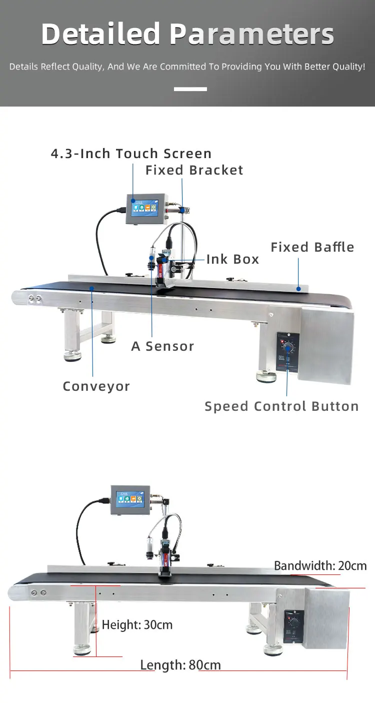 Printer Size:202*119*61.2mm Shipping Package: 24.4*12.6*13cm | Conveyor Stand: 155*35*25cm (shipping package) G.W.: 20KG |